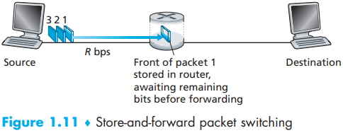 In this example, the source has three packets, each consisting of L bits, to send to the destination. At the snapshot of time shown in Figure 1.11, the source has transmitted some of packet 1, and the front of packet 1 has already arrived at the router. Because the router employs store-and-forwarding, at this instant of time, the router cannot transmit the bits it has received; instead it must first buffer (i.e., "store") the packet's bits. Only after the router has received all of the packet's bits can it begin to transmit (i.e., "forward") the packet onto the outbound link.