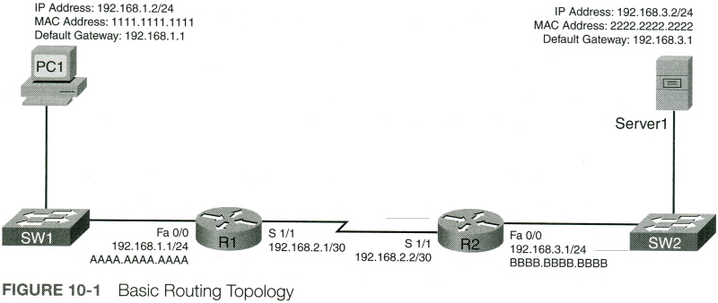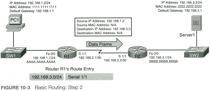To understand basic routing processes, consider figure 10-1. In this topology, PC1 needs to send traffic to Server 1. Notice that these devices are on different networks. In this topology, how does a packet from the source IP address 192.168.1.2 get routed to the destination IP address 192.168.3.2?
