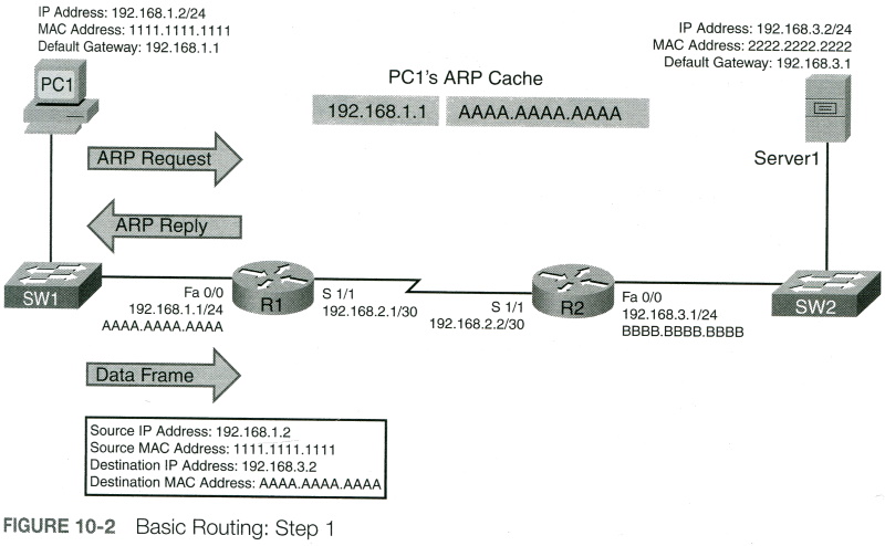 PC1 compares its IP address and subnet mask 192.168.1.2/24 with the destination IP address and subnet mask 192.168.3.2/24. PC1 concludes that the destination IP address resides on a remote subnet. Therefore, PC1 needs to send the packet to its default gateway, which could have been manually configured on PC1 or dynamically learned via Dynamic Host Configuration Protocol (DHCP). In this example, PC1 has the default gateway 192.168.1.1 (router R1). However, to construct a Layer 2 frame, PC1 also needs the MAC address of its default gateway. PC1 sends an Address Resolution Protocol (ARP) request for router R1's MAC address. After PC1 receives an ARP reply from router R1, PC1 adds router R1's MAC address to its ARP cache. PC1 now sends its data in a frame destined for Serer1, as shown in Figure 10-2.