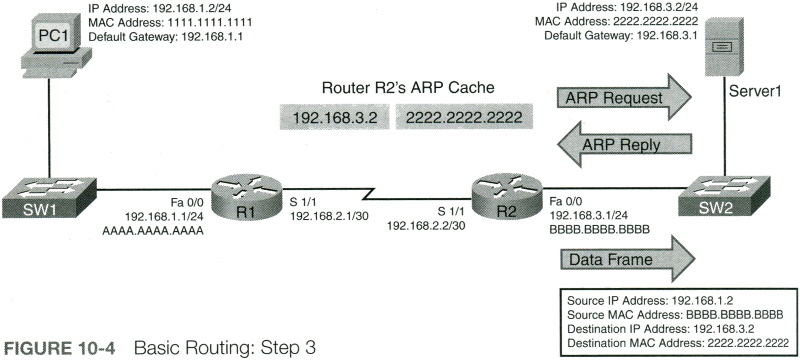When router R2 receives the frame, it decrements the TTL in the IP header, just as router R1 did. Again, as long as the TTL has not been decremented to 0, router R2 interrogates the IP header to determine the destination network. In this case, the destination network 192.168.3.0/24 is directly attached to router R2's Fast Ethernet 0/0 interface. Similar to the way PC1 sent out an ARP request to determine the MAC address of its default gateway, router R2 sends an ARP request to determine the MAC address of Server1. After an ARP reply is received from Server1, router R2 forwards the frame out its Fast Ethernet 0/0 interface to Server1, as illustrated in Figure 10-4.
